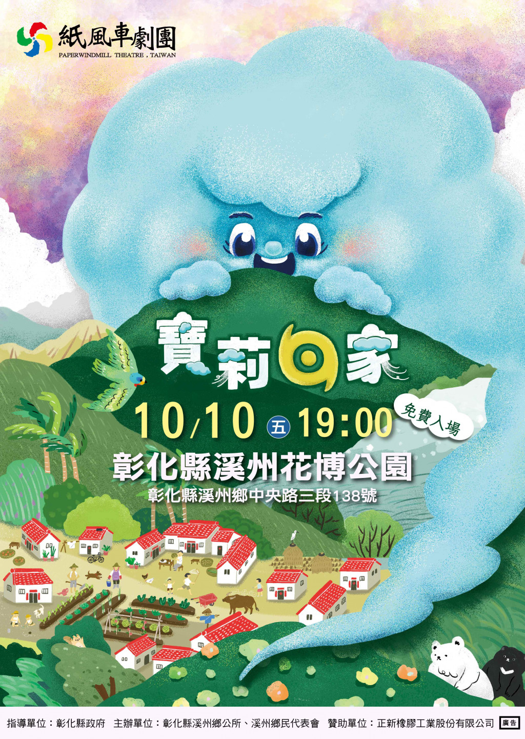 10月10日(星期五)晚上7點於溪州鄉溪州公園,演出「紙風車兒童劇團」《寶莉回家》,免票入場,歡迎闔家觀賞。