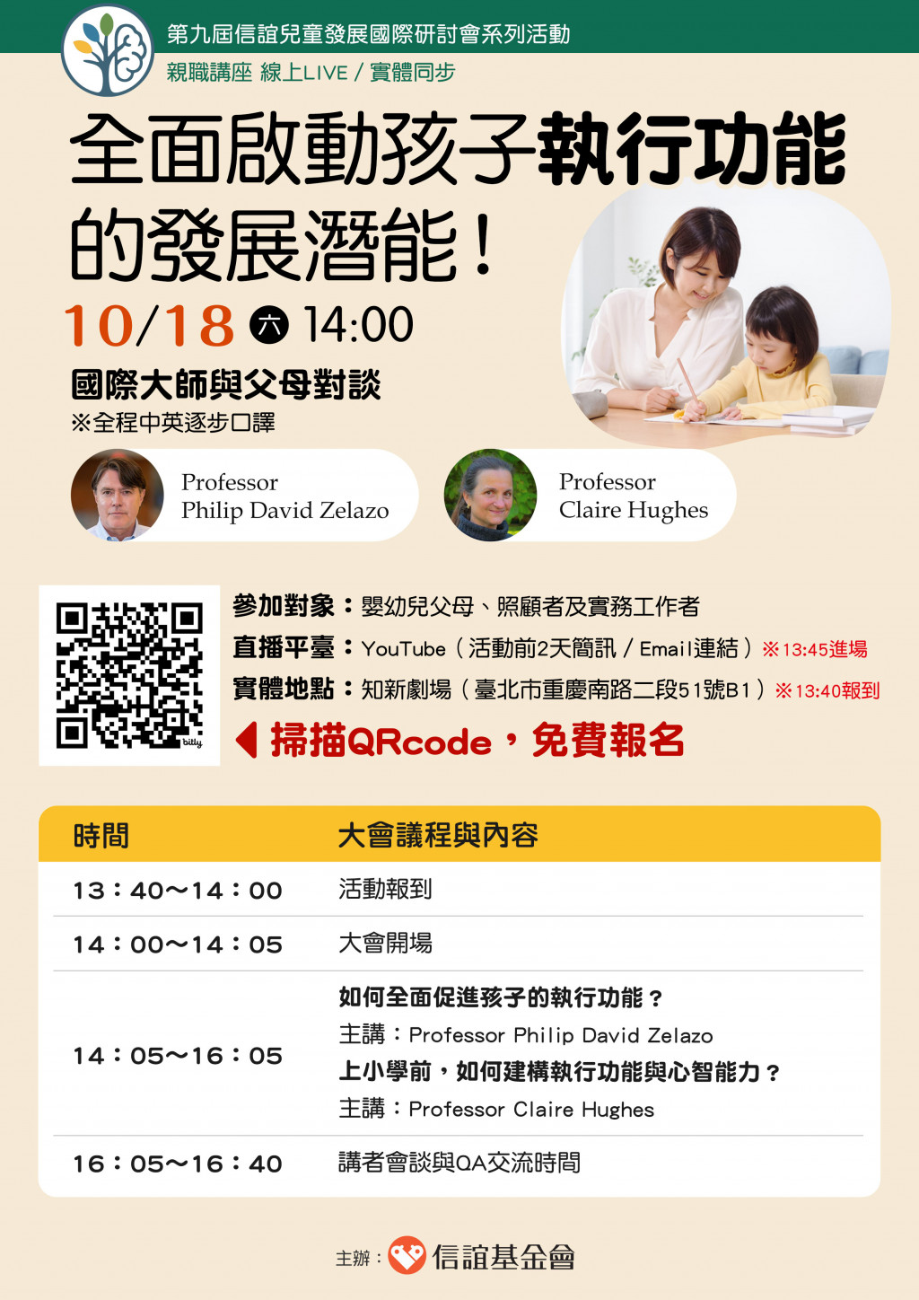 信誼基金會於10/18(六)舉辦第九屆兒童發展國際研討會親職講座【國際大師與父母對談:全面啟動孩子執行功能的發展潛能!】
