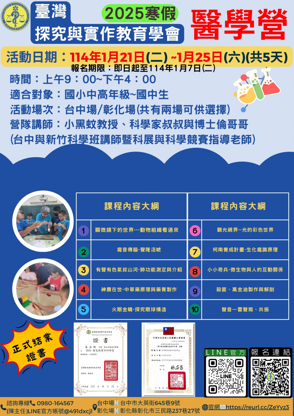 | 主旨: | 為鼓勵學生培養實作能力從做中學,動手玩科學,本會舉辦「臺灣探究與實作教育學會2025寒假醫學營」,歡迎學生踴躍參加。 |
