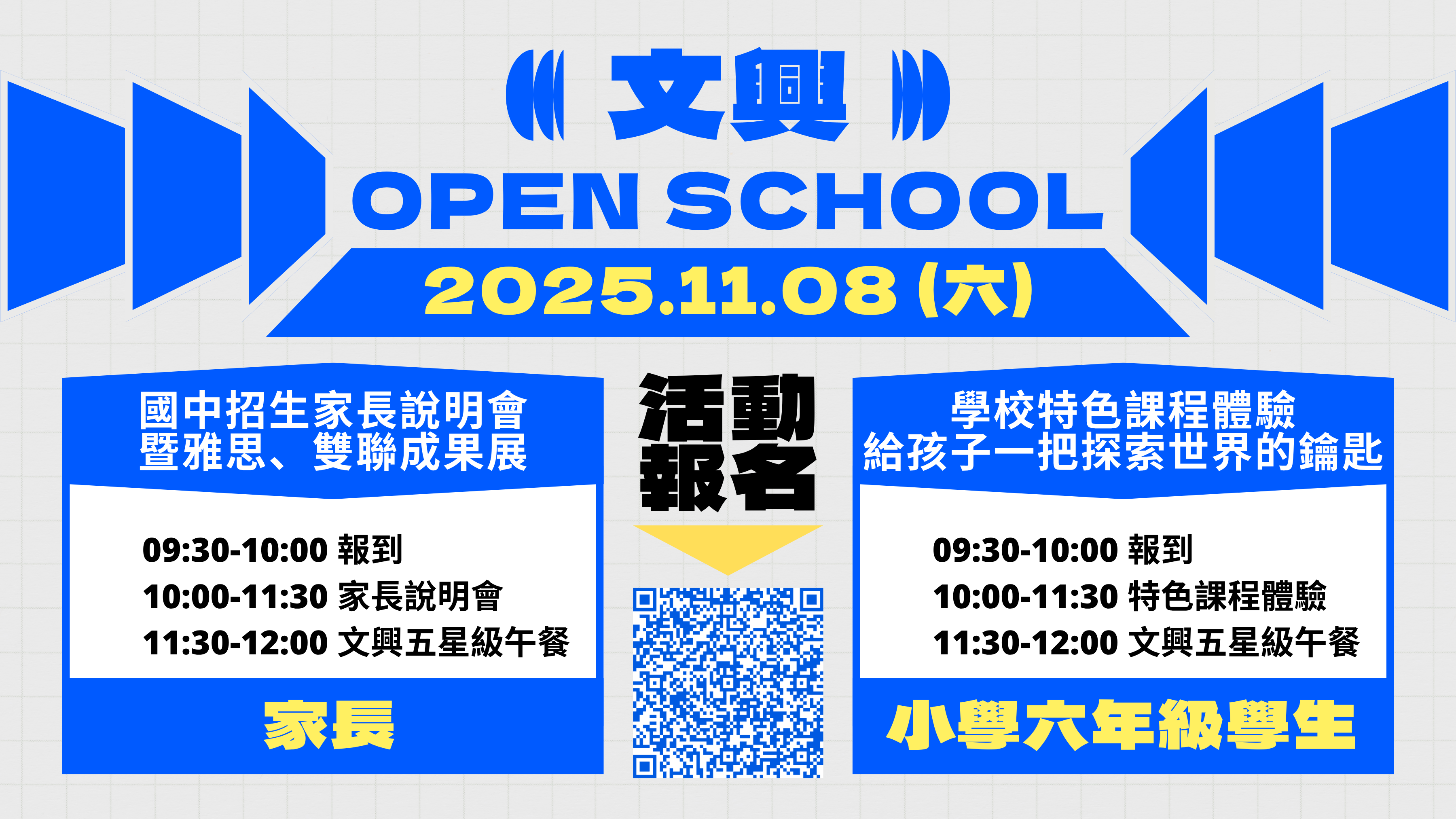 三、 為使社區家長了解本校基督為本的核心教育理念,並讓社區學生認識天主教學校,特於114年11月8日(六)上午文興OPEN SCHOOL DAY辦理學生闖關遊戲及家長說明會。