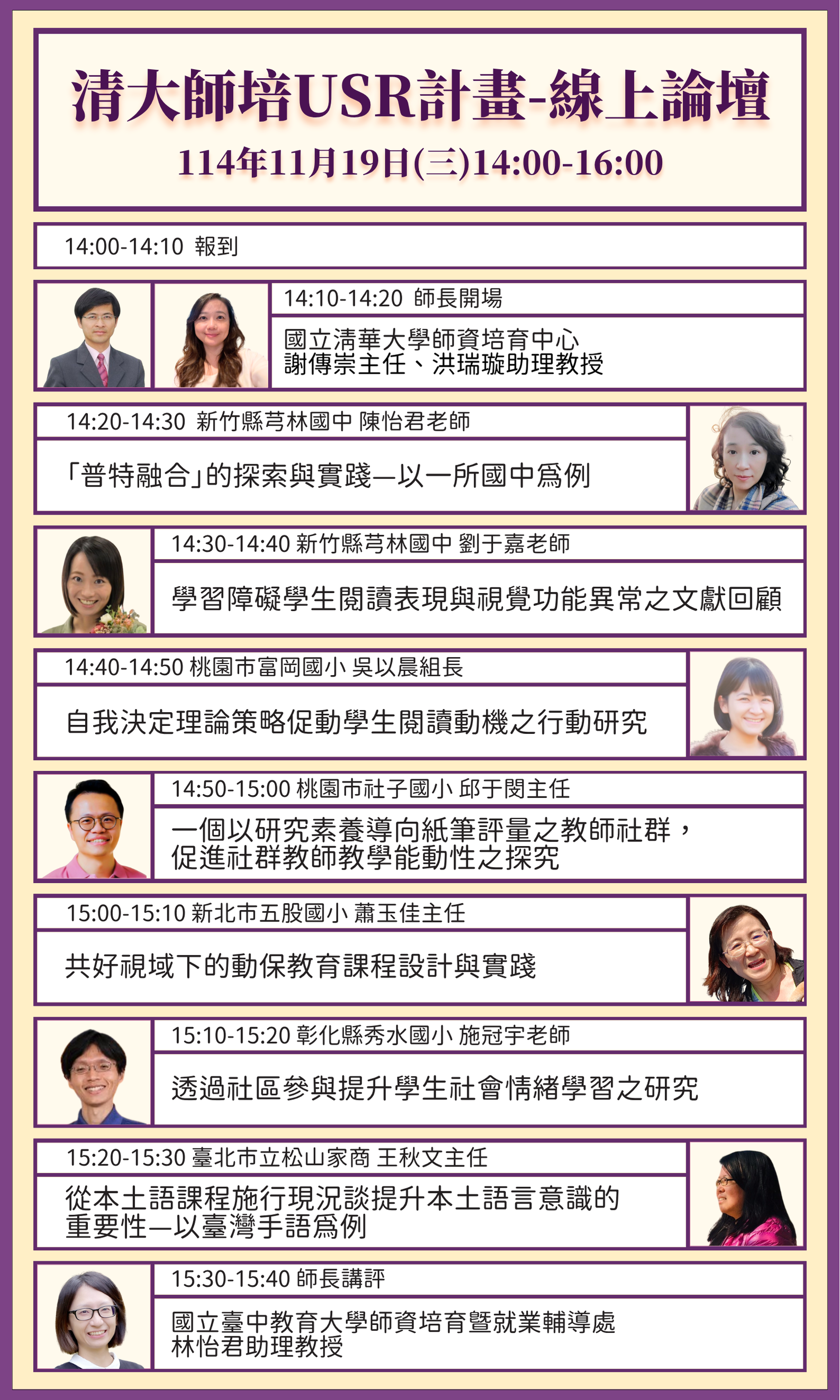 一、依據國立清華大學114年11月3日清師培字第1149008551號函辦理。 二、為推廣國立清華大學USR計畫之研究成果,爰辦理線上論壇,邀請參與計畫教師分享教學實踐與行動研究經驗,以促進跨域交流與專業對話。 三、線上論壇資訊如下: (一)時間:114年11月19日(星期三)下午2時至4時。 (二)方式:視訊會議,連結:https://meet.google.com/vtx-kejk-grj。 (三)報名: 1、即日起至114年11月17(星期一)中午12時止。 2、連結:https://forms.gle/1aSW2VYnvQzRjNW88。 四、全程參與者提供2小時之教師研習時數。 五、檢附論壇海報1份(如附件)。 |