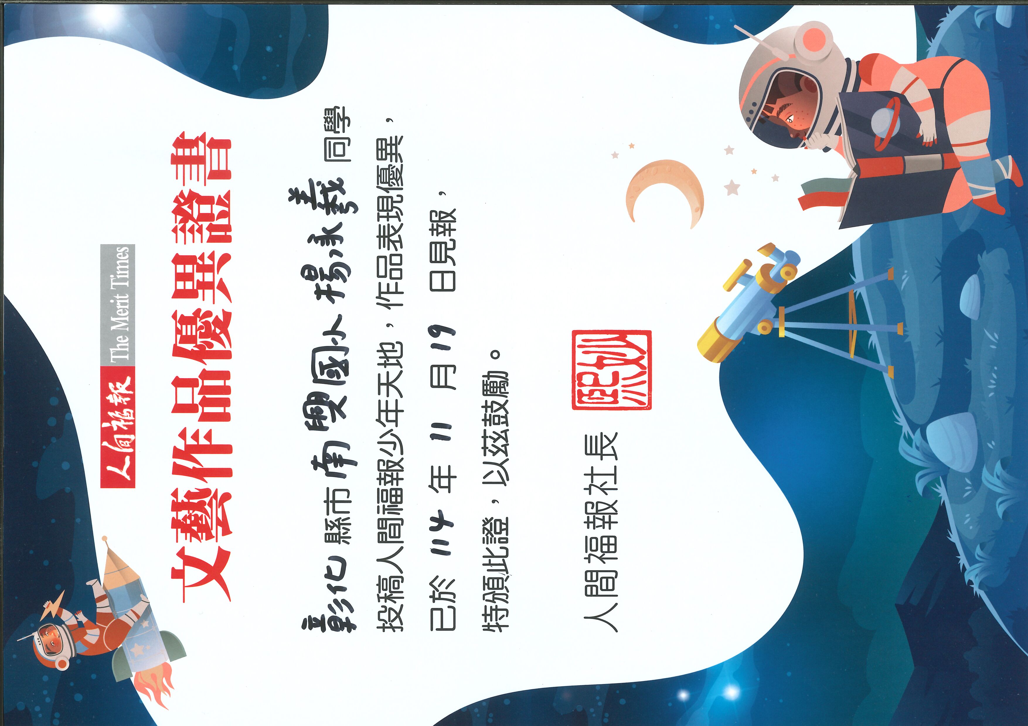 賀!本校學生二年戊班楊承羲圖畫作品獲人間福報第9263號刊登