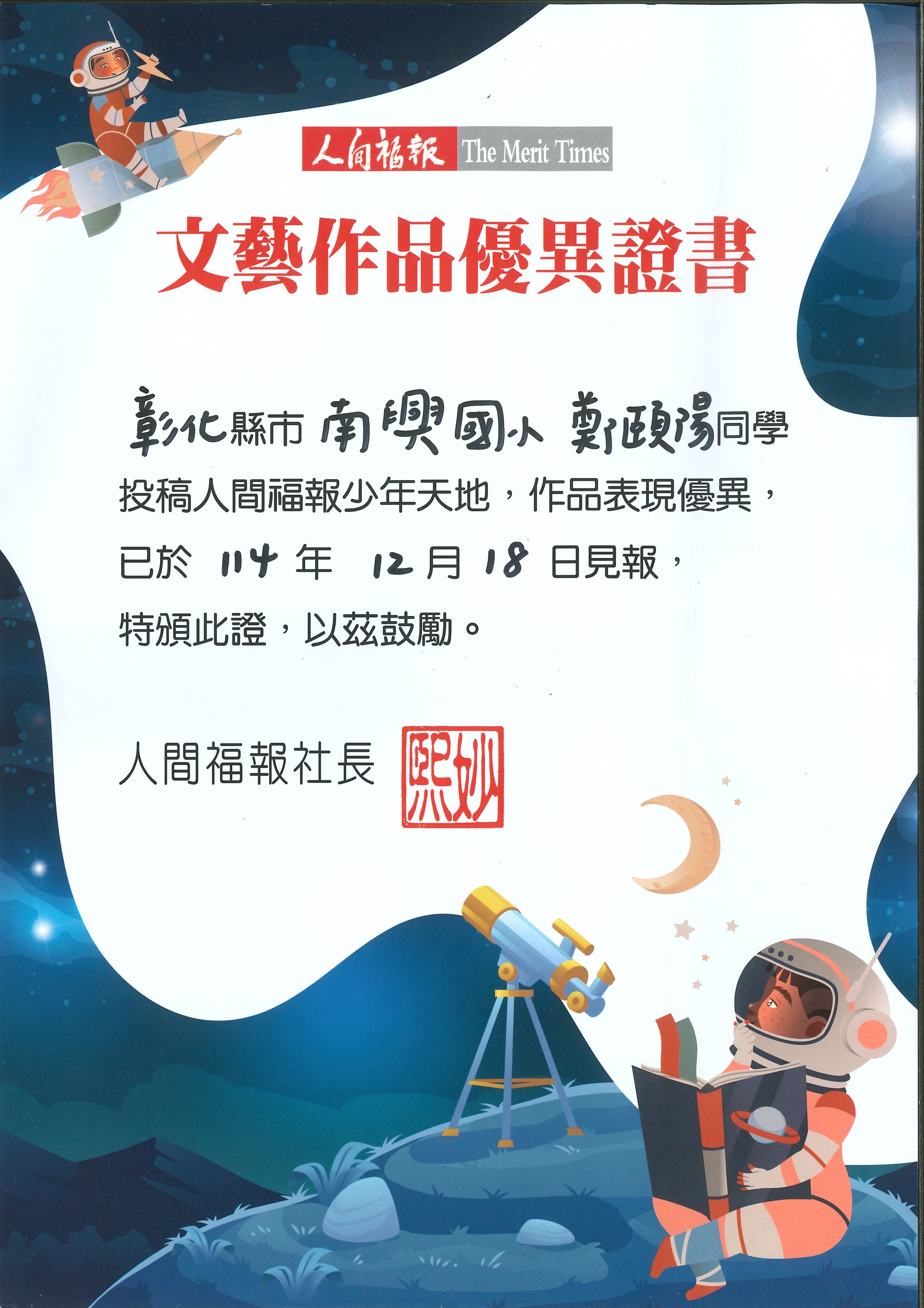 賀!學生鄭頤陽作品獲人間福報刊登。