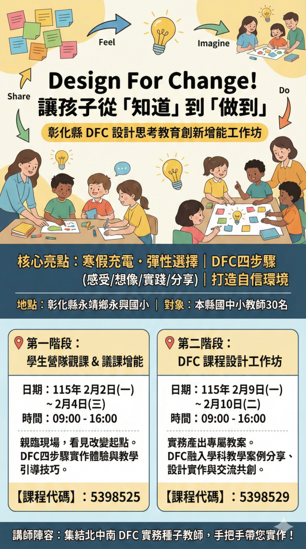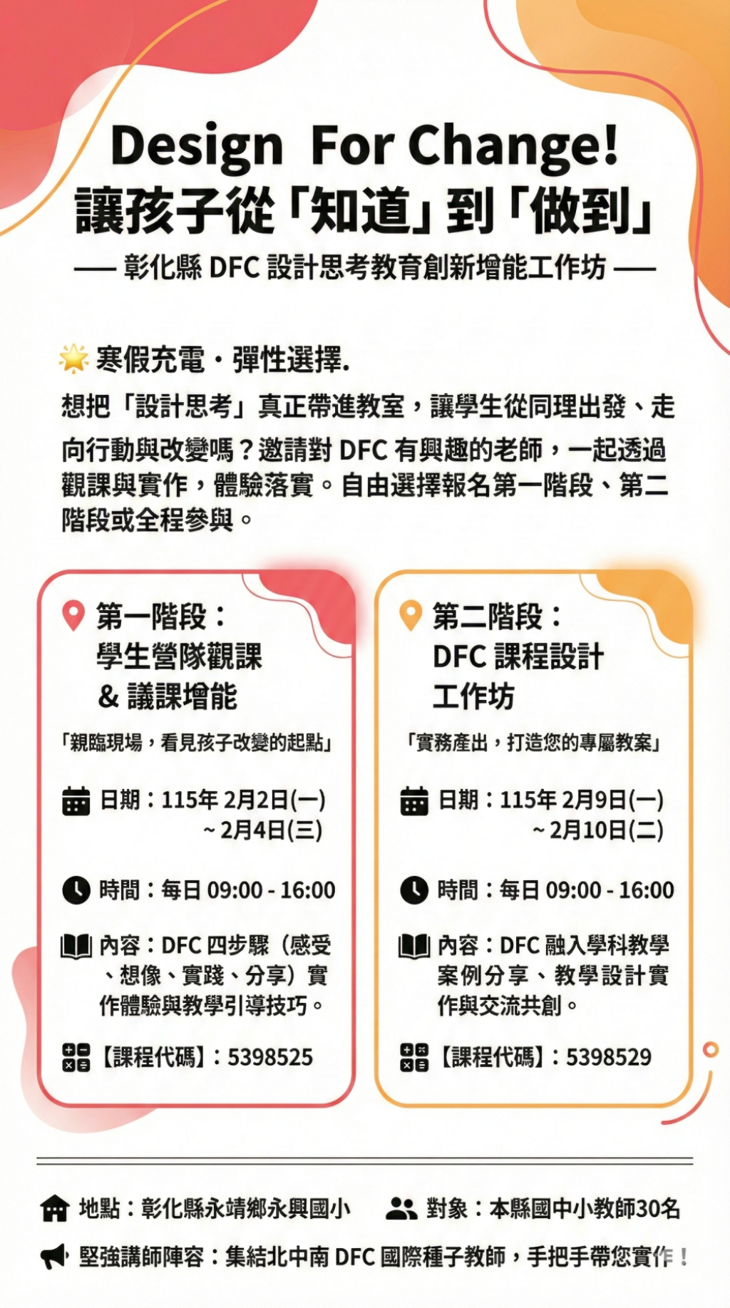 (二)115年2月9日、2月10日,每天 9:00~16:00(上午9時至下午4時為教師DFC課程設計工作坊)