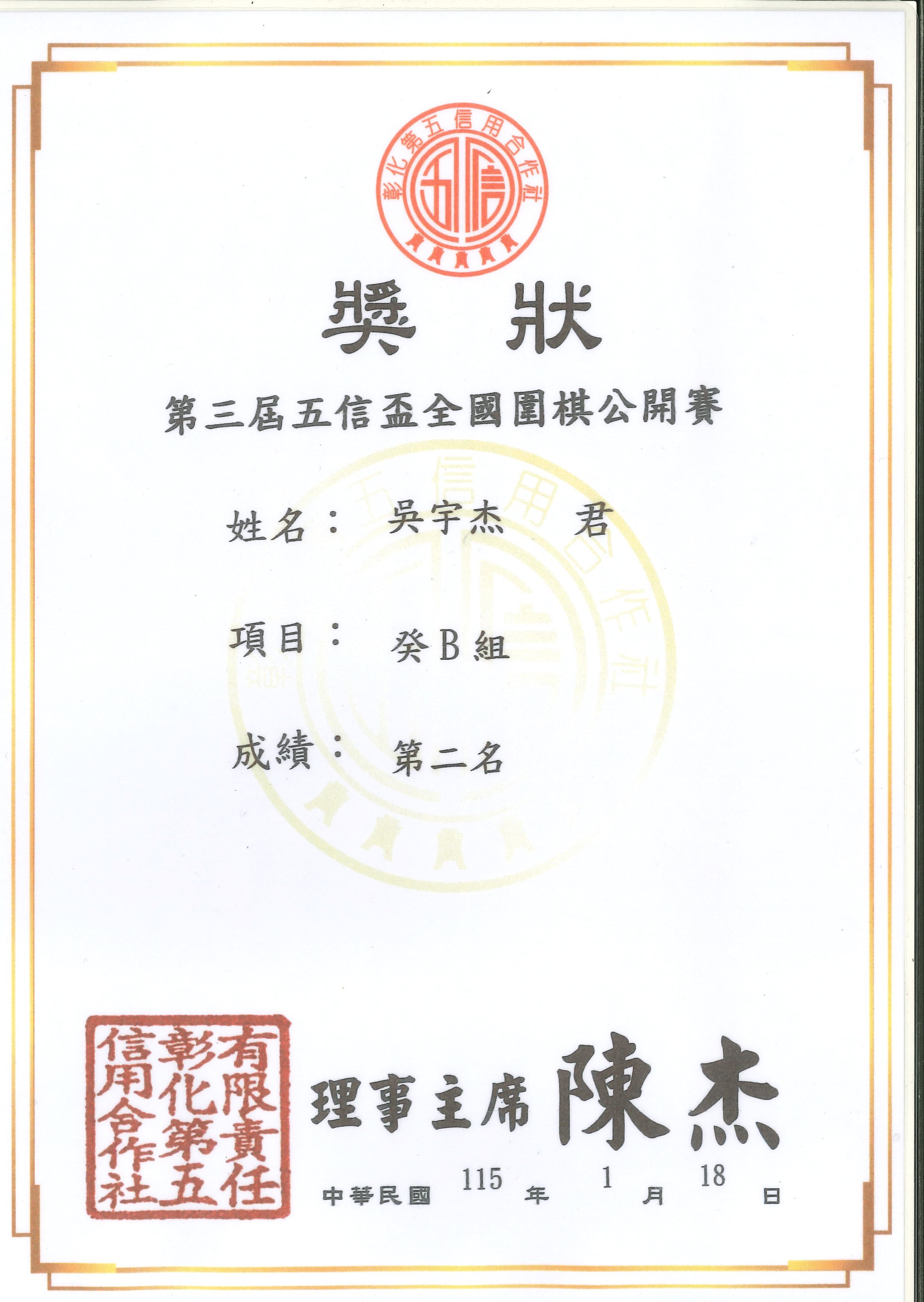 賀!四年丙班吳宇杰獲第三屆五信杯圍棋公開賽癸B組第二名