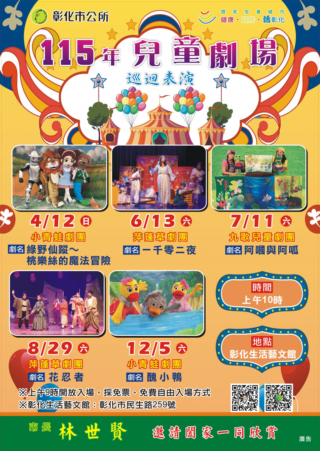 彰化市「115年兒童劇場巡迴表演」節目表,歡迎週知。
